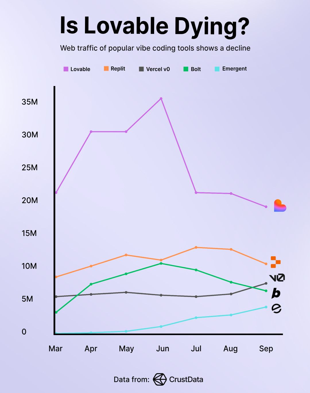 Actually, we’re already seeing (shoutout to CrustData) a decline in usage across tools like Loveable and others (as of October 2025), suggesting that the solo-founder playbook might not scale as well as people thought.