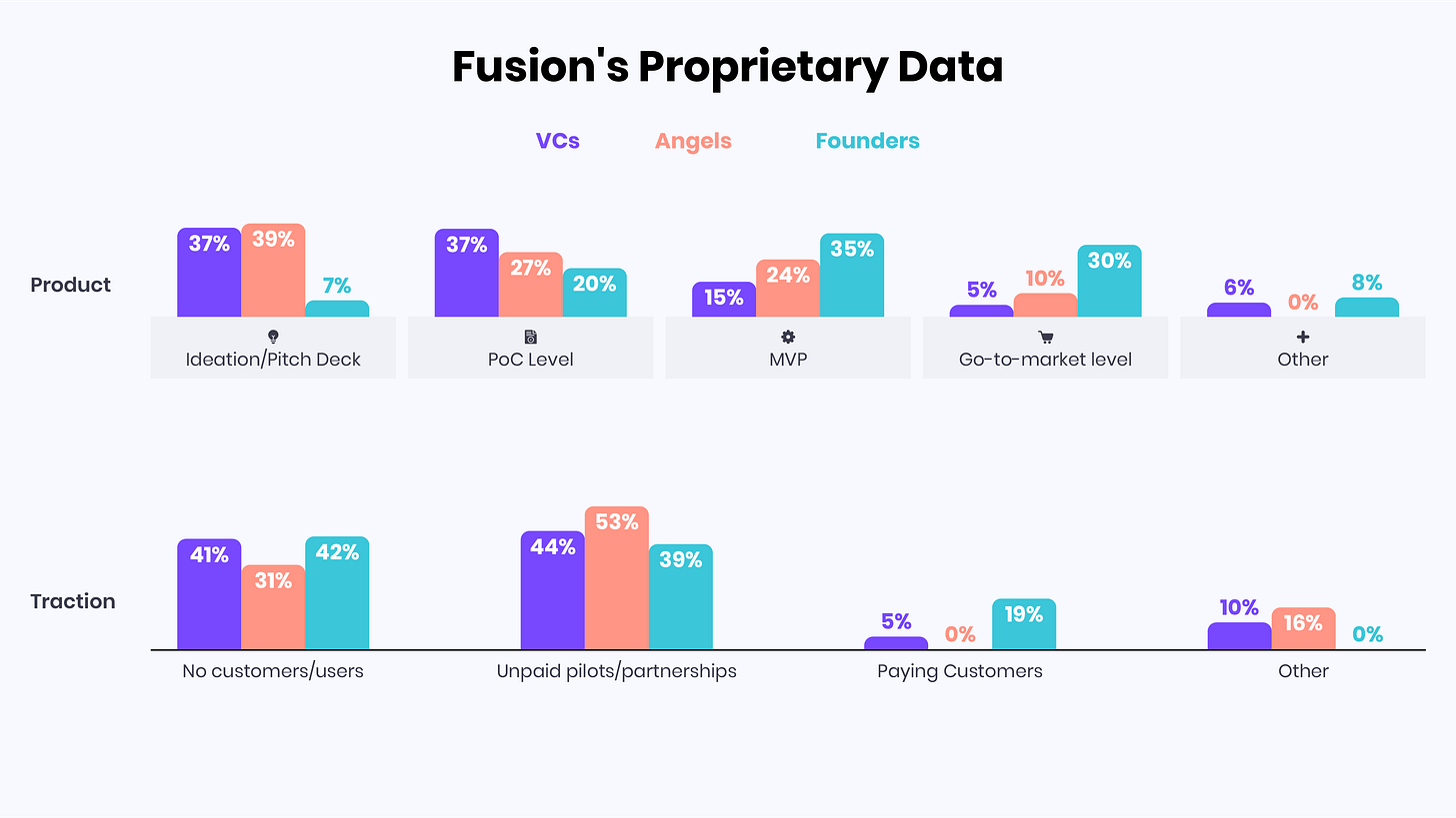On the left side of the graph below, you’ll see data from our 2024 Pre-Seed report, where we asked top Israeli angels and VC funds what they expect from founders at the Pre-Seed stage in terms of product maturity and traction. On the right side, you’ll see what we actually observed from the founders we met at Fusion in 2025.